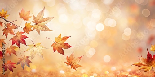 Autumnal foliage with a bokeh background featuring vibrant red and orange maple leaves gracefully falling