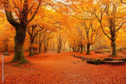 autumn, forest, fall, tree, pathway, gold, orange, red, leaf, nature, wood, scenic, beauty, colourful, sunlight, foggy, calm, tranquil, peaceful, lush, vibrant, autumn, foliage, park, dense, carpet, image, view, landscape, colours