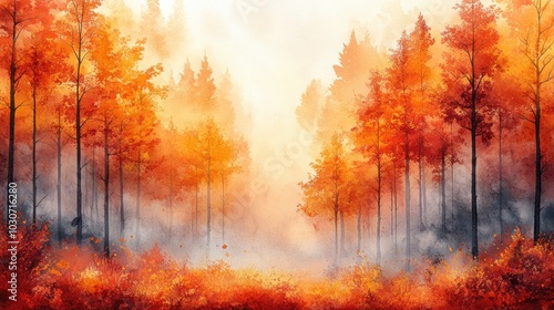 forest, tree, fall, autumn, leaf, orange, red, yellow, nature, timberland, foliage, gold, vibrant, scenery, landscape, watercolor, art, painting, artwork, illustration, mist, fog, sunrise, sunlight, morning, peaceful, tranquil, calm, dreamy, serene, beauty, colours, seasonal, wood, branch, sky, soft, glow, bright, natural, tree, season, leaf, park, sun, wood, colours, green, colourful