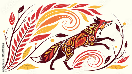Autumnal fox illustration with decorative leaves and swirls vector art design element for nature lovers