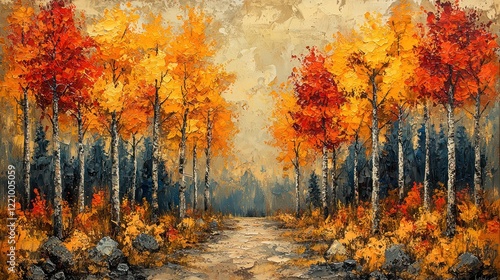 Autumnal Path: A Vibrant Oil Painting of Golden and Red Trees