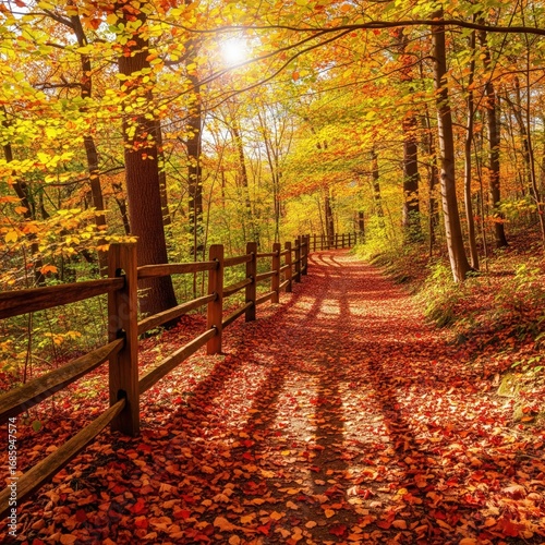 Autumnal path winding through a forest with vibrant foliage, bathed in warm sunlight, the ground carpeted with colorful fallen leaves, bordered by a rustic wooden fence on one side