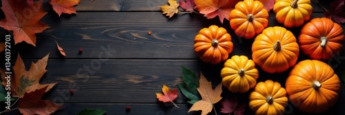 Autumnal pumpkin arrangement on dark wooden table, , nature
