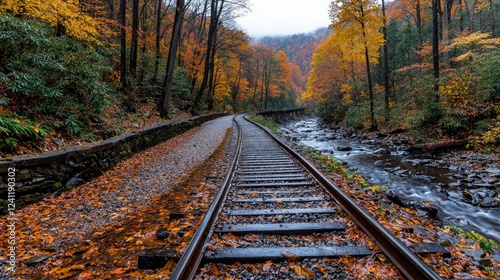 rail, trail, autumn, fall, foliage, stream, river, leaf, tree, forest, nature, landscape, scenic, travel, photo, picturesque, season, colourful, vibrant, beauty, calmness, peaceful, serene, wilderness, wood, railway, track, path, paseo, water, rock, mountain, view, scenery, background, image, photo, picture