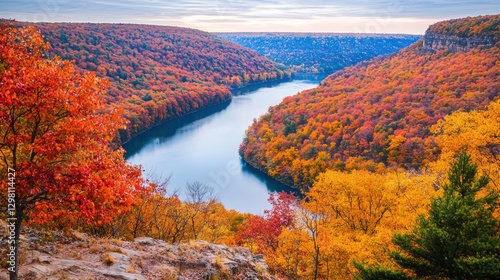 Autumnal River Gorge: A breathtaking panorama of vibrant fall foliage reflecting on a serene river winding through a deep gorge.
