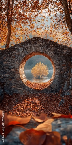 autumn, river, stone, archway, leaf, fall, tree, yellow, gold, orange, brown, nature, landscape, scenery, view, framed, circular, window, hole, opening, perspective, tranquil, serene, peaceful, calm, water, bank, foliage, colours, sunlight, light, shadow, branch, background, season, october, november, image, photograph, picture, art, beauty, picturesque
