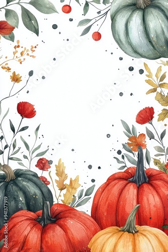 pumpkin, pumpkin, fall, autumn, leaf, foliage, watercolor, illustration, frame, border, design, harvest, thanksgiving, october, nature, decorative, floral, branch, berry, red, green, orange, yellow, white, background, banner, greeting card, invitation, seasonal, festive, autumn, painted, art, graphic, design element, creative, watercolor, graphic design, scrapbook, digital artwork, clip art, cute, rustic