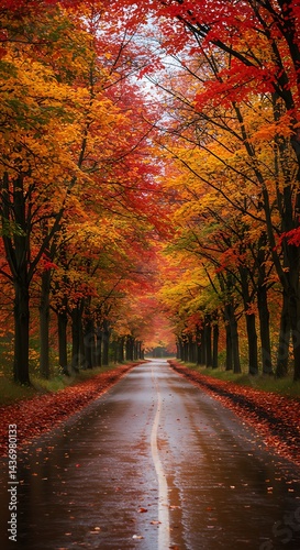 tree, road, lane, path, leaf, foliage, colourful, vibrant, red, orange, yellow, gold, nature, landscape, scenery, season, colours, forest, alley, way, travel, journey, wet, damp, asphalt, majestic, tranquil