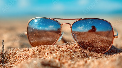 Aviator sunglasses rest on a sandy beach, reflecting the sky and a blurry figure