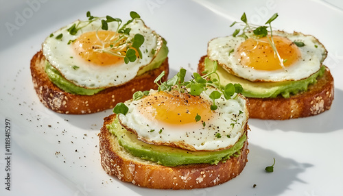 Avocado Egg Sandwiches for healthy breakfast. Whole grain toasts with mashed avocado, fried eggs and organic microgreens