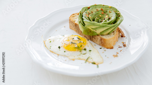 Avocado rose on toast with sunny side up egg on white plate and white background.