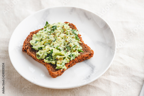 Avocado sandwich with rye bread on a plate. The concept of healthy balanced food.