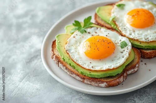 toast, avocado, egg, fried, eating, serving, preparing, plating, closeup, still life, studio shot, healthy, brunch, breakfast, food, cookery, meal, dish, yolk, white, parsley, green, yellow, pepper, grain, slice, bread, table, plate, ingredient, nourishment, diet, vitamin, delicious, fresh, tasty, morning, lifestyle, homemade, cooking