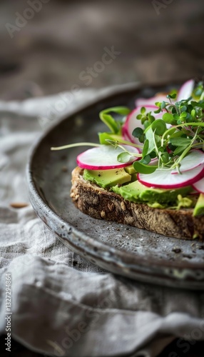 Avocado Toast with Radish and Microgreens on Rustic Plate for Culinary Inspiration