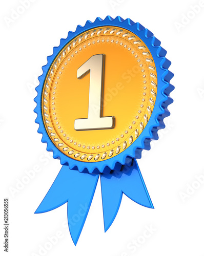 award ribbon number one 1. 1st first place medal golden blue. champion winner reward, achievement success icon. 3d illustration, isolated