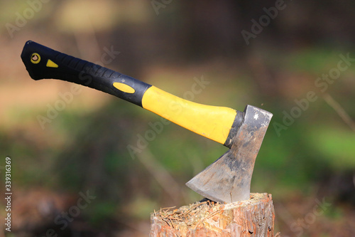 object, timber, bark, cleaving, hard, hand, industry, vintage, chopper, chock, day, hit, heap, abstract, trunk, equipment, summer, eco, deforestation, iron, nature, grip, wood, axe, yellow, wooden, hatchet, sharp, tool, handle, tree, metal, work, stump, firewood, blade, cut, forest, steel, dash, build, classic, heavy, done, brown, war, chop, village