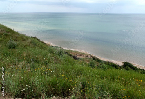 Azov sea coastal area with smooth green grass slope. Seashore view with blue sky horizon.