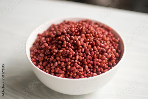 Azuki or Adzuki beans (Japanese red bean or red mung bean) after soaked in white bowl isolated on a table closed up. Selective focus blurred background.
