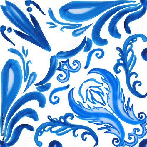 Azulejo ceramic tiles. Seamless pattern of traditional Italian majolica. Hand drawn watercolor blue pattern. Sicilian design print for fabric