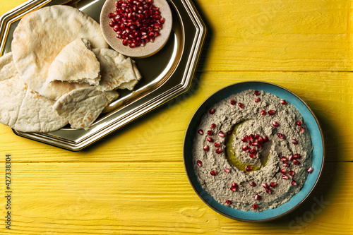 Baba ganoush or mutabal, Middle Eastern eggplant dip sauce garnished with pomegranate seeds, with various ingredients