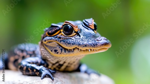 Baby Alligator on Rock Vivid Detail Macro Photography Close-up Portrait View Scaly Texture Curious Gaze Lush Green Background Dark Jewel Tones Perfect for Nature Documentaries
