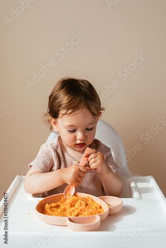 baby, baby food, baby girl, background, beige, carrot, children, childhood, copy space, copy space, face, food, girl, ravenous, children, lunch, meal, plate, portrait, sitting, spoon, studio, sunlight, tasty, toddler
