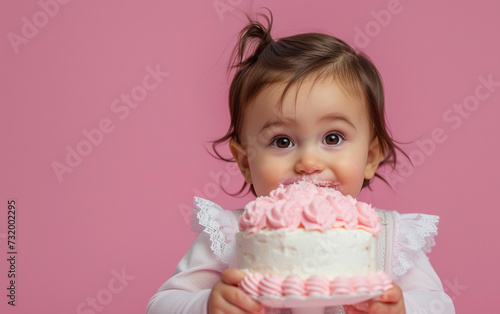 Baby girl with Birthday cake showing dessert on solid color background with copyspace for text