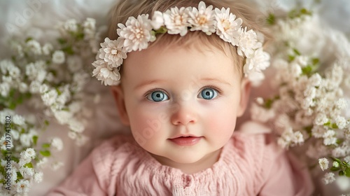 baby, girl, infant, toddler, children, portrait, flower, white flower, blossom, springtime, nature, landscape, background, environment, beautiful, pretty, cute, adorable, innocent, sweet, eye, blue eye, fair hair, blonde hair, soft focus, macro, closeup, studio shot, hi-res, happy baby, expression, emotion, childhood, innocence, purity, delicate, gentle, peaceful, serene, calm, family, love, motherhood
