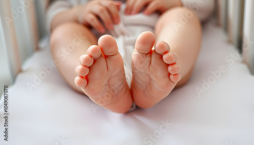 baby, holding, foot, toe, cot, closeup, childhood, isolated, white, highlight, infant, sleep, nap, relaxation, comfort, contentment, joy, adorable, cuteness, innocence, serenity, peaceful, cosy, safe, security, love, affection, parenting, motherhood, parenthood, family, bonding, growing, development