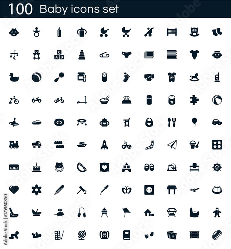 Baby icon set with 100 vector pictograms. Simple filled child icons isolated on a white background. Good for apps and web sites.