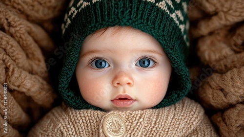 baby, infant, children, cute, adorable, expression, knitted, hat, blanket, newborn, looking, closeup, portrait, eye, face, smiling, toddler, little, calm, peaceful, innocence, joy, tender, warm, love, carefree, family, motherhood, fatherhood, sweet, healthy, precious, soft, gentle, calmness, happy, content, innocent, children