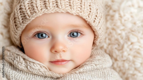 baby, infant, toddler, children, portrait, closeup, knitwear, sweater, hat, winter, eye, cute, adorable, sweet, innocent, beautiful, lovely, precious, little, small, newborn, face, expression, calm, peaceful, serene, happy, joyful, healthy, family, love, care, warmth, comfort, soft, texture, background, wool, beige, neutral, photo, image, stock, photo