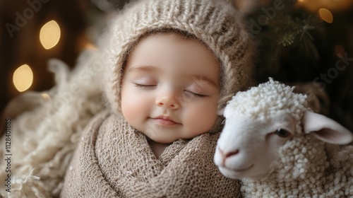 baby jesus holy night cute newborn baby wrapped in a brown scarf with sheep on dark background