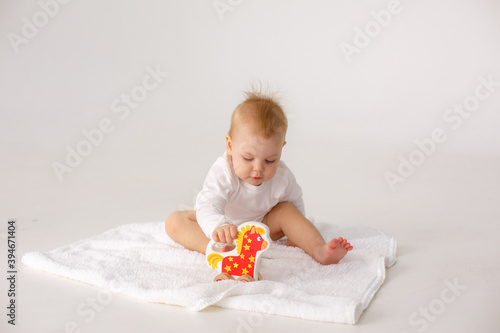 baby playing with a colorful toy isolated on a white background