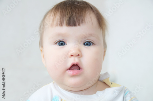 baby portrait with open mouth looking with interest, happy Caucasian infant nine month kid face,European little girl looking at camera