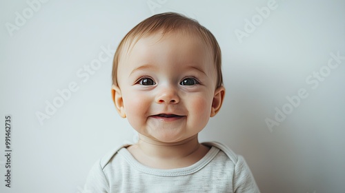 Baby smiling at the camera with a blank wall behind them, leaving space for copy.