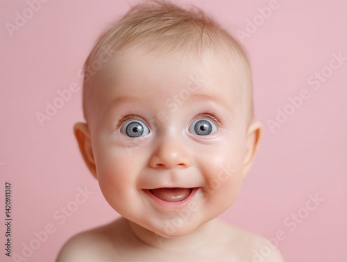 Baby with sparkling eyes and natural Duchenne smile, pastel pink background