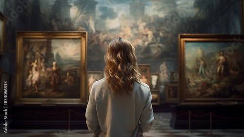 Back portrait of an adult woman looking at museum paintings in an old museum art gallery