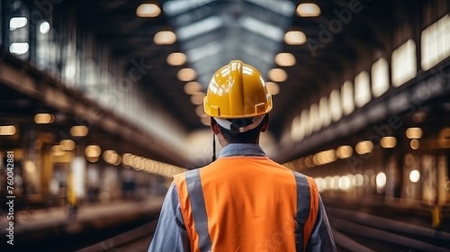 Back side view engineer under inspection and checking construction process railway switch and checking work on railroad station .Engineer wearing safety uniform and safety helmet in work.