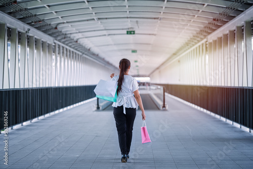 Back side woman walking and hand hold shopping bag in a corridor. Back side woman walking and hand hold shopping bag in a corridor.