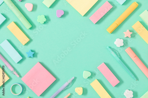 Back to school background. Flat lay, top view of colorful scattered stationery on isolated light green table background. School supplies on desk. Copyspace.