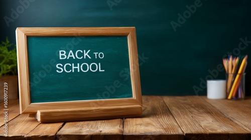 Back to school chalkboard on wooden table with stationery in classroom setting