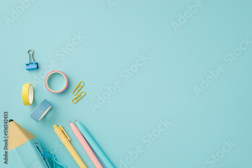 Back to school concept. Top view photo of school supplies colorful pens blue pencil-case adhesive tape and binder clips on isolated pastel blue background with copyspace