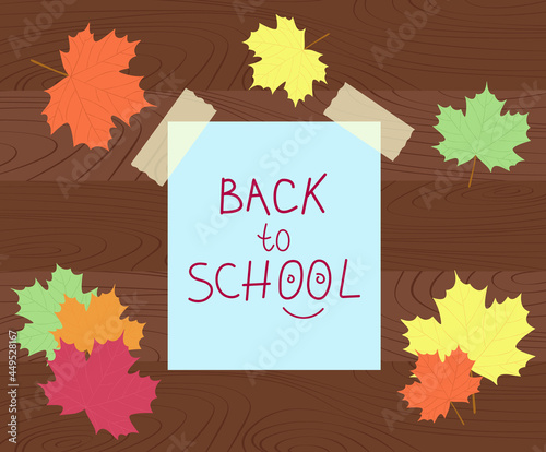 Back to school lettering on sticky note. Maple leaves on wooden table background. Vector illustration