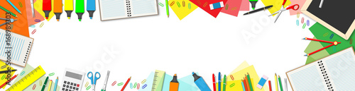 accessory, school, student, children, wax crayons, colours, ruler, learning, compass, notebook, education, banner