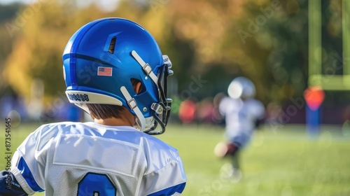 Back view of a boy in a football uniform playing on a field, sports career dreams, aspiring athlete