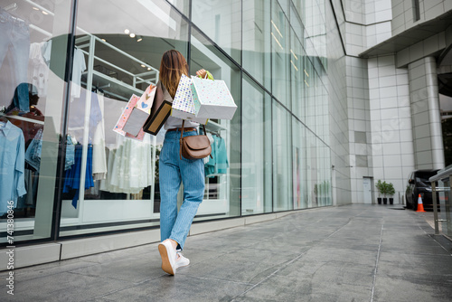 Back view of a fashionable woman with shopping bags walking on a crowded sidewalk in the city, surrounded by vibrant movement and colorful transportation. She is a modern consumer, always on the go.