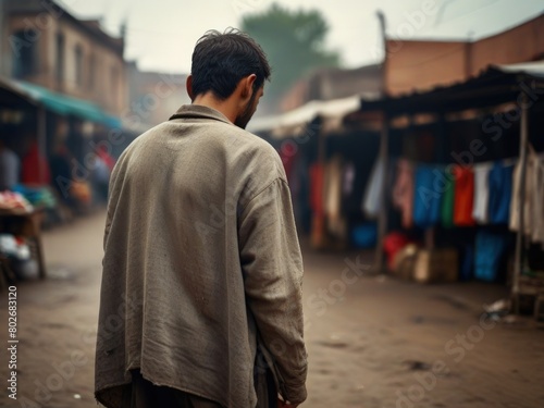 back view of a poor homeless person on the street of a market wearing dirty old and torn clothes, financial instability concept