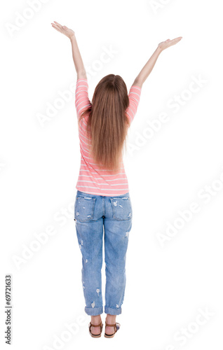 Back view of Beautiful woman in jeans looking at wall and Holds