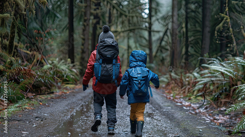 Back View of Boys on a Forest Road with Backpacks, Adventure Journey, Outdoor Exploration, Kids Hiking, Nature Trail, Woodland Path, Young Travelers, Scenic Forest Scene, Youth Adventure, Travel and E